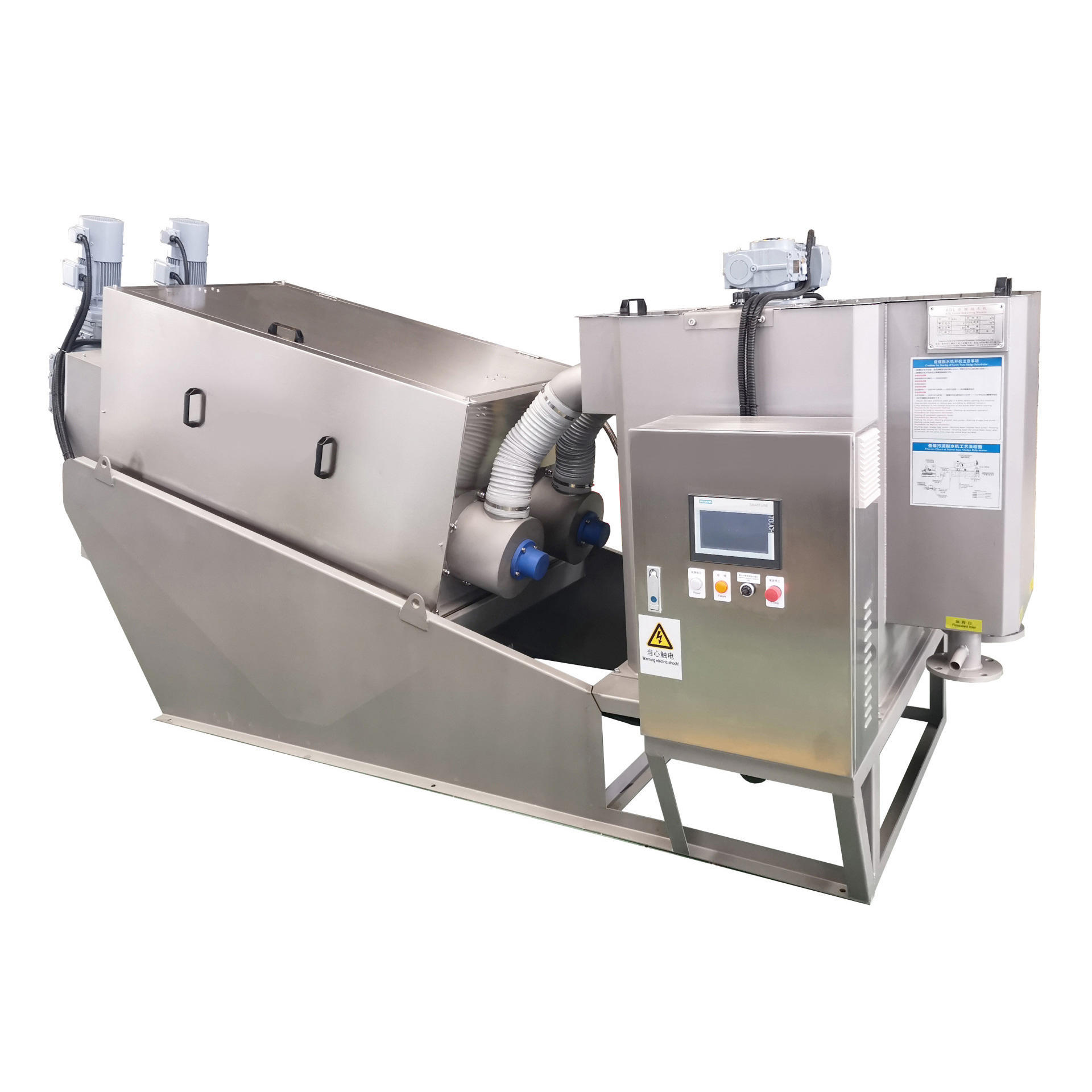De machine voor het ontwateren van slib met meervoudige schroeven is voorzien van een volledig automatisch bedieningscabinet, een flocculatiebak, een bodem voor de verdikking en ontwatering van slib en een vloeistofverzamelbak.die onder volledig automatische bedrijfsomstandigheden een efficiënte flocculatie kan realiseren en een continue complete verdikking, persing en ontwatering van het slib mogelijk maakt, en vervolgens het verzamelde filtraat terugbrengen naar de stroom of de afvoer.